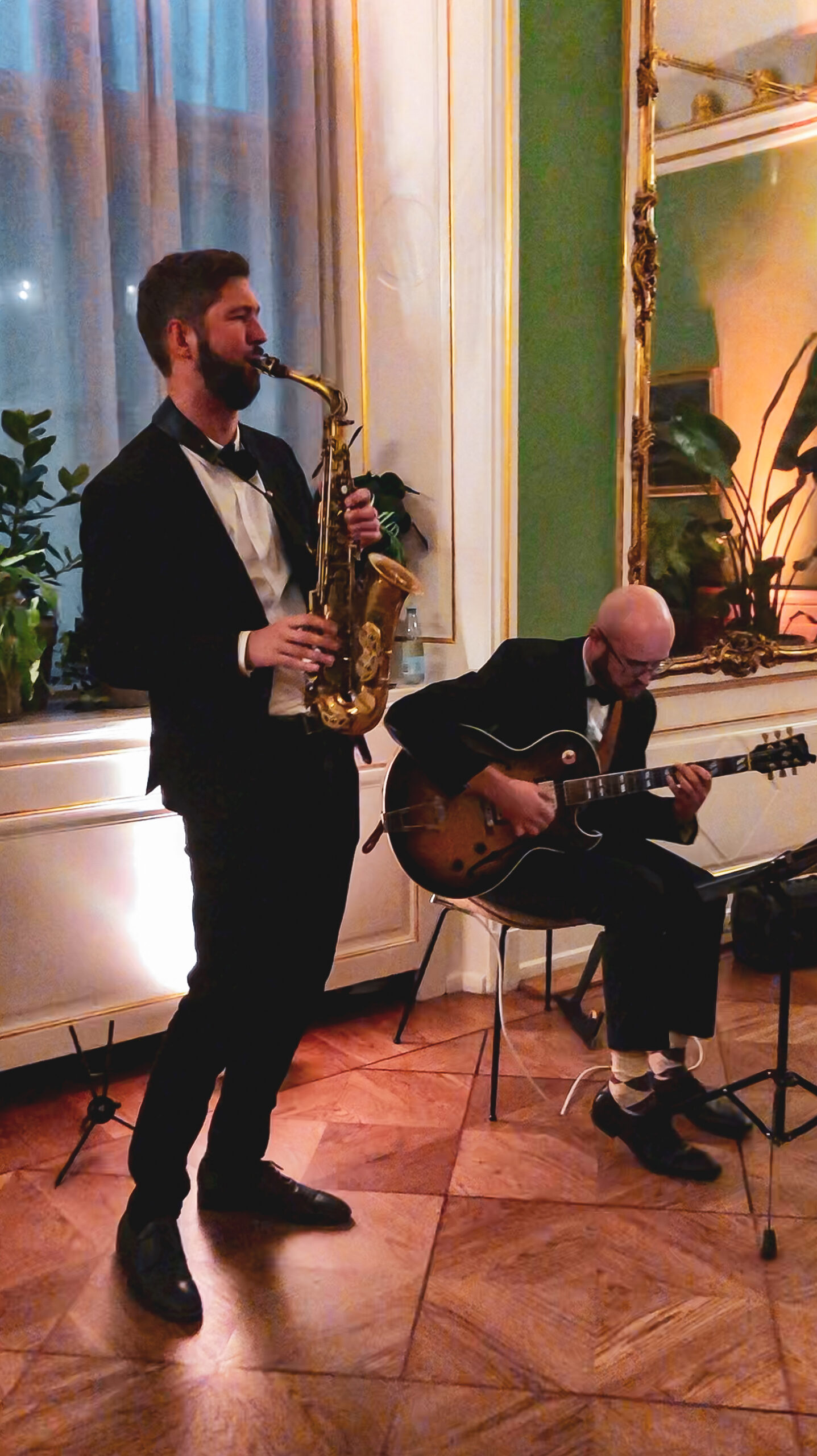 Metropolitan Jazz Duo är essensen av enkelhet och musikalisk finess. Med saxofonens skarpa toner och gitarristens harmoniska förståelse skapar duon en unik musikalisk upplevelse som ger både värme och elegans till ditt evenemang. Deras kompakta storlek gör dem idealiska för allt från intima mottagningar och middagar till större evenemang där utrymmet är begränsat men stämningen måste vara på topp.